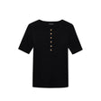 A modern, Henley-inspired tee made from a dense cotton-spandex blend with an all-over ribbed texture and a soft hand. This elevated basic features a high crew neckline and gold monogram snap buttons along the front placket.